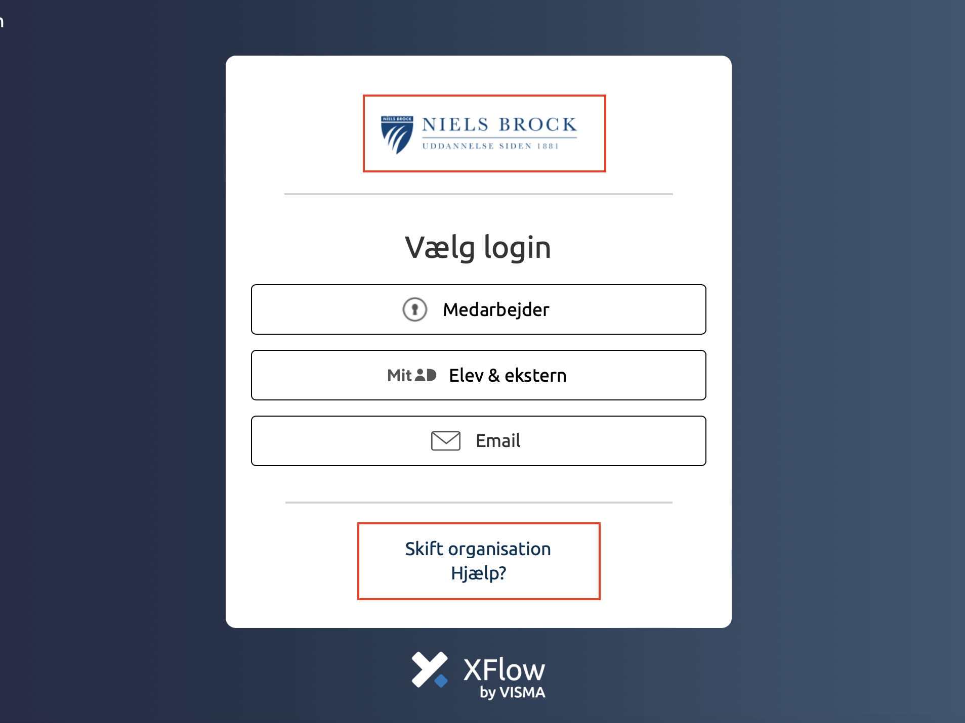 Husk at vælge Niels Brock som organisation – hvis det ikke står automatisk, skal du selv vælge det under “Skift organisation”.
